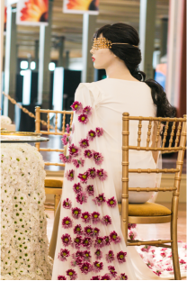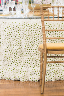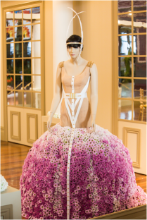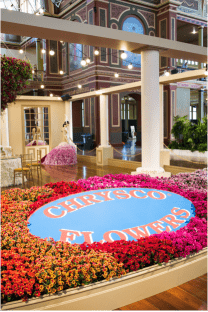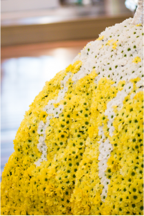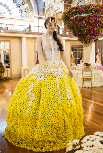 Our main attraction was a huge 150 square metres in size, positioned directly under the magnificent dome inside the Royal Melbourne Exhibition Building (the biggest stand in the history of MIFGS we were told!). This was the ‘Chrysco Ballroom’, which carried a masquerade theme with three magnificent gowns created out of our flowers and a huge 4-tiered floral chandelier hanging above the main table, of which the tablecloth also featured white Chrysanthemums flower heads en masse to create a fabric effect. Five professional dancers brought our ballroom ‘to life’ 3 times each day performing a beautiful contemporary dance routine much to the delight of hundreds of onlookers and giving them a peek at the amazing floral wall hidden behind the mirrored doors!